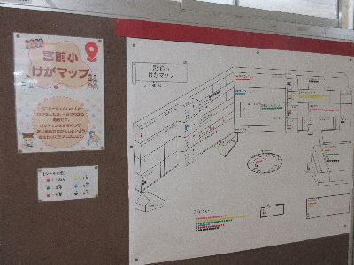 〇保健室前に掲示されている「けがマップ」どんなところでのけがが多いのでしょう。低学年は教室が多いようです。室内では静かに過ごしましょう。