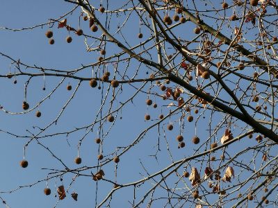 〇プラタナスに実がついていました。別名「スズカケノキ」の由来となっています。熟すと種のついた綿毛が飛び出します。