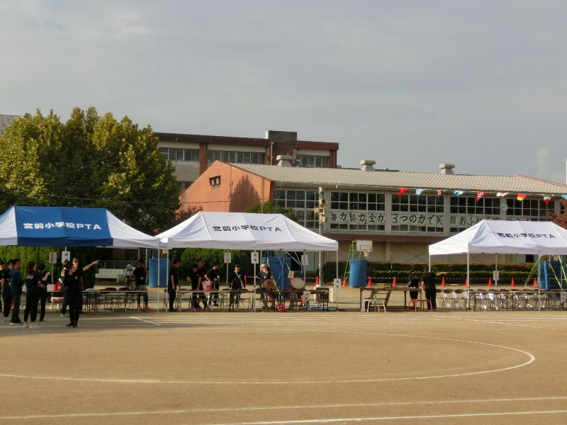 〇早朝からの運動会準備も完了。青空も見えますが、この後の天気が心配。