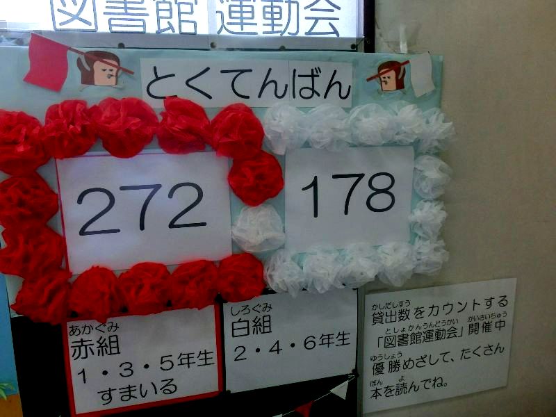 〇秋の読書月間の取組の一つ「図書館運動会」。図書館を利用して、たくさんの素敵な本と出会えるといいですね。